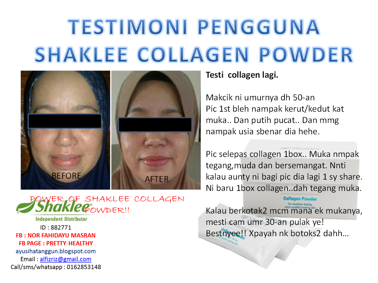 - Semakin kita menua, tubuh kita menghasilkan semakin kurang kolagen, mengakibatkan lebih banyak kedutan dan garis halus, disamping kulit yg semakin kendur. Umur bukanlah hanya faktor yang menyebabkan kekurangan kolagen di dalam tubuh kita. Kerosakan kolagen juga boleh dipercepatkan dgn faktor luaran seperti matahari , radikal bebas di udara, air dan nutrisi, merokok dll. Justeru it, Shaklee Collagen Powder mampu membantu kulit kita mengekalkan elastisiti semulajadi dan memperlahankan kehadiran kedut2